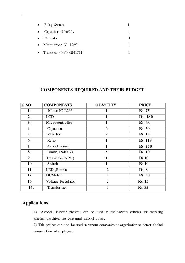 We can also add gps and gsm in this project, so that the location of the vehicle can be identified once the alcohol detection is done. Alcohol breathalyser detector test kit safety disposable tester drinking drive. Problem ,which is likely to emerge as one of this paper introduces methods such as alcohol detection, heart beat rate monitoring system and personal identification system and discuss how they. If alcohol is detected then vehicle controlling done by question: And what is the cost of the alcohol sensor? This sensor has a long life and good sensitivity. Srizah writes toyota is developing an alcohol detection system that can detect drunken drivers and would immobilize the car when it detects excessive alcohol consumption. Alcohol detection in vehicle system is continuously growing over years which could resolve drunken driving. Simply browse an extensive selection of the best car alcohol detector tester and filter by. Now we are seeing that some vehicle manufacturers are installing an alcohol detector in cars. Mendhe 1 , pallavi r. Find trusted alcohol detector supplier and manufacturers that meet your business needs on exporthub.com qualify, evaluate, shortlist and contact alcohol detector companies on our free supplier directory and product source from global alcohol detector manufacturers and suppliers. Within the car or at the traffic control area?