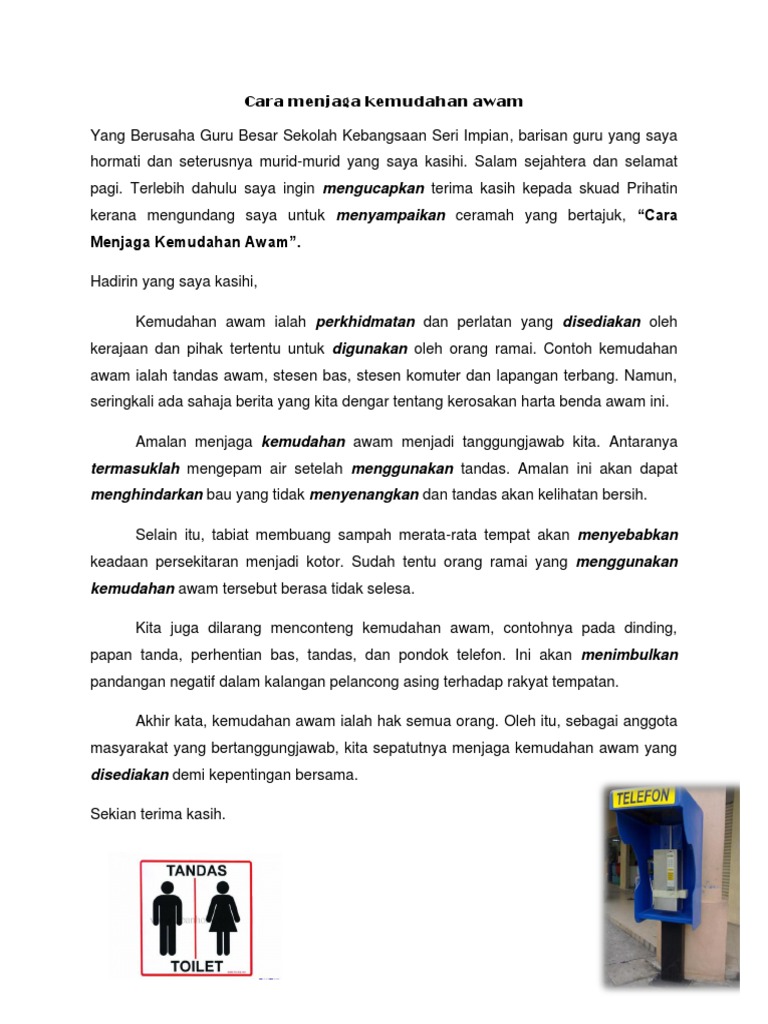 Yang berusaha guru besar sekolah kebangsaan seri impian, barisan guru yang saya hormati dan seterusnya murid murid yang. Tanggung jawab menjaga kemudahan awam. Berikut ini adalah adab cara menjaga kemudahan awam. Karena kita harus menjaga kemudahan kita yang lebih penting, diri kita sendiri. Cara meningkatkan tanggungjawab menjaga kemudahan awam: